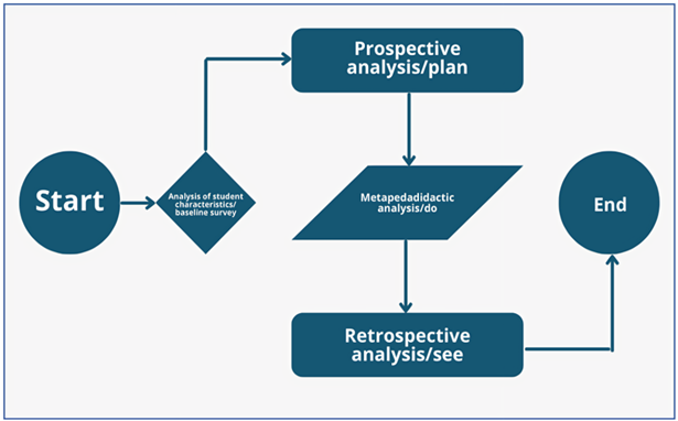 The data collection procedures in this study adhered to the didactical design research stages. In the initial stage, prospective analysis, the researcher collaborated with three other lecturers to scrutinize students’ characteristics and needs, including hobbies and expectations for their favorite lectures. Following this analysis, a plan in the form of a blended lecture design was prepared collectively, with one lecturer chosen as the model. The next stage, metapedadidactic analysis, involved other lecturers with student activity observation sheets observing the model lecturer as she delivered offline lectures using the blended design. Concurrently, one lecturer recorded lecture videos. The final stage, retrospective analysis, consisted of the model lecturer sharing experiences and receiving suggestions from observers, which informed revisions or redesigns of the blended lecture design (Fitriati et al., 2023; Marfuah et al., 2022). Refer to Figure 1 for more details.