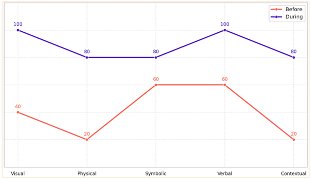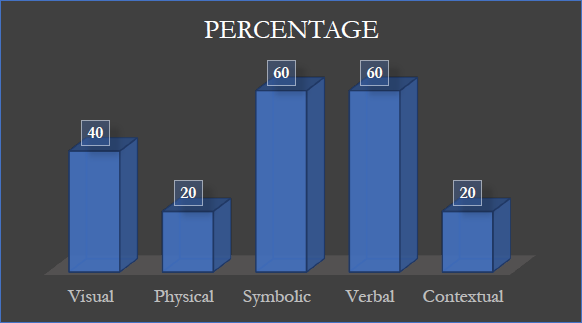 During the implementation of a STEM-based blended lecture design, student representation performance was evaluated. As a result, visual ability reached 100%, and around 80% of students were able to represent contextually. The comparison is depicted in Figure 9. Figure 9 shows that there is an increase in the percentage or number of students who are able to create visual representations by 60%. In relation to physical representation, there is an increase of around 60% in the number of students, 20% for symbolic representation, 40% for verbal representation, and 60% for contextual representation. In other words, there is an increase in the variety of forms of representation used by students after the implementation of the STEM-based blended lecture design.