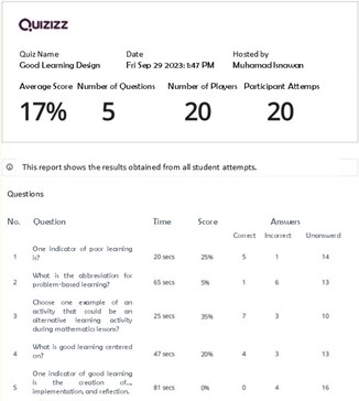 A few minutes after watching, some students responded to the video by answering questions. WS (student 2) emphasized that the main message of the video is that every small act of kindness has a big impact on oneself and others. MH (student 3) salso highlighted something similar: that small actions have a big impact on the future. Even though the students’ responses were in line with the objectives of Let’s Watch, there was a shortage in time allocation due to the large number of questions, which took time for students to give long answers. The next activity, Let’s Play, involved students scanning a QR code and using the Quizizz game code from a model lecturer. Students were actively involved in the game without any problems, even though the model lecturer did not provide follow-up to their answers. The main goal of this activity was to ensure students’ understanding of the prerequisites, which are represented in Figure 6.